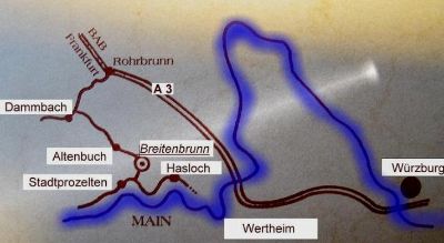 Variante 2: Von der A3 aus Richtung Würzburg kommend Ausfahrt Marktheidenfeld, dann Richtung Kreuzwertheim - dann Hasloch - dann Faulbach -danach rechtsabbiegen nach Breitenbrunn.